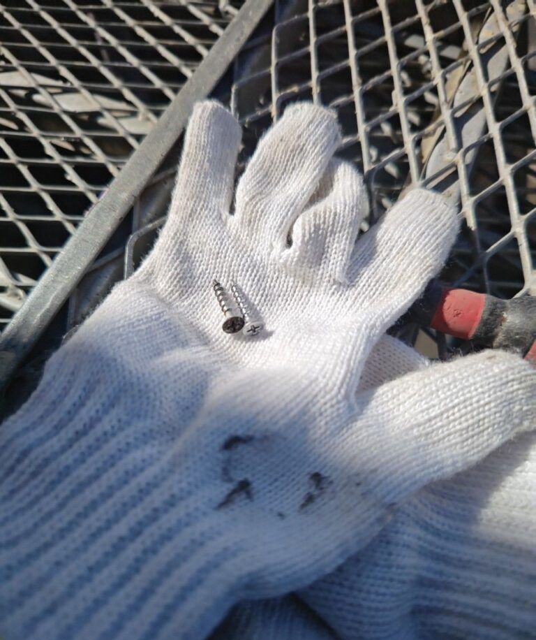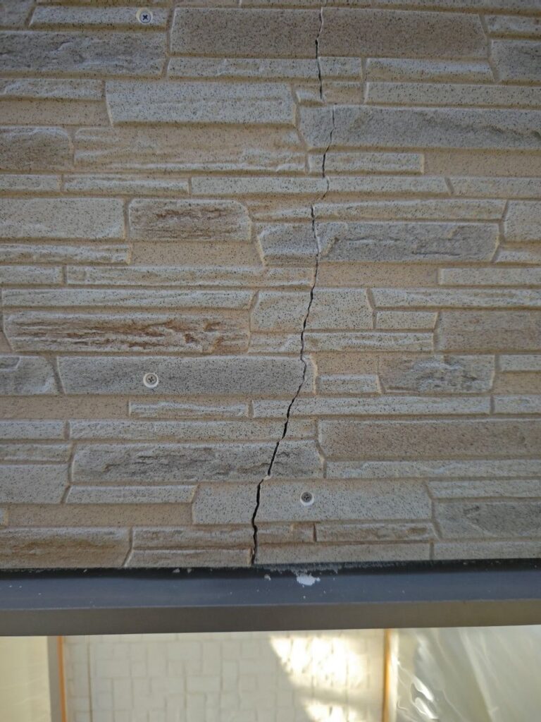 ↓クラック補修、ビス止め ヒビ割れに合わせ外壁の浮き、欠落防止の為に下地に合わせビス止めをいたしました。