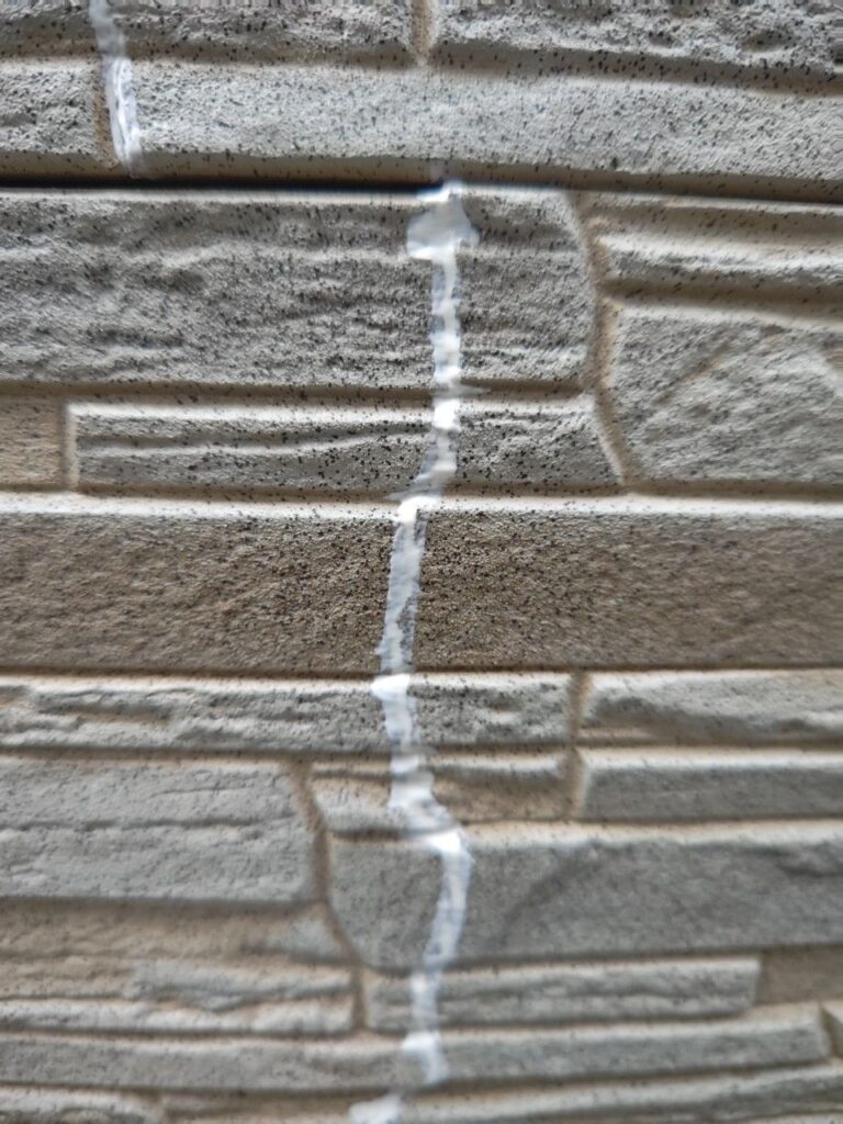 ↓外壁クラックパテ処理 専用プライマーを塗布後にキズを広げ過ぎないようにクラック処理をいたしました。使用パテは、オートンアドハ3500弾性パテ
