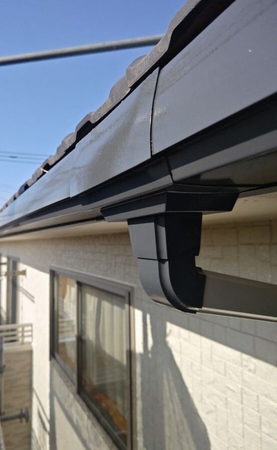 ↓塗装工事後 使用材料は雨樋はファインsi破風板は板金でしたのでサビ止めプライマー塗布後に防錆硬化剤使用ファインsiで仕上げさせていただきました。